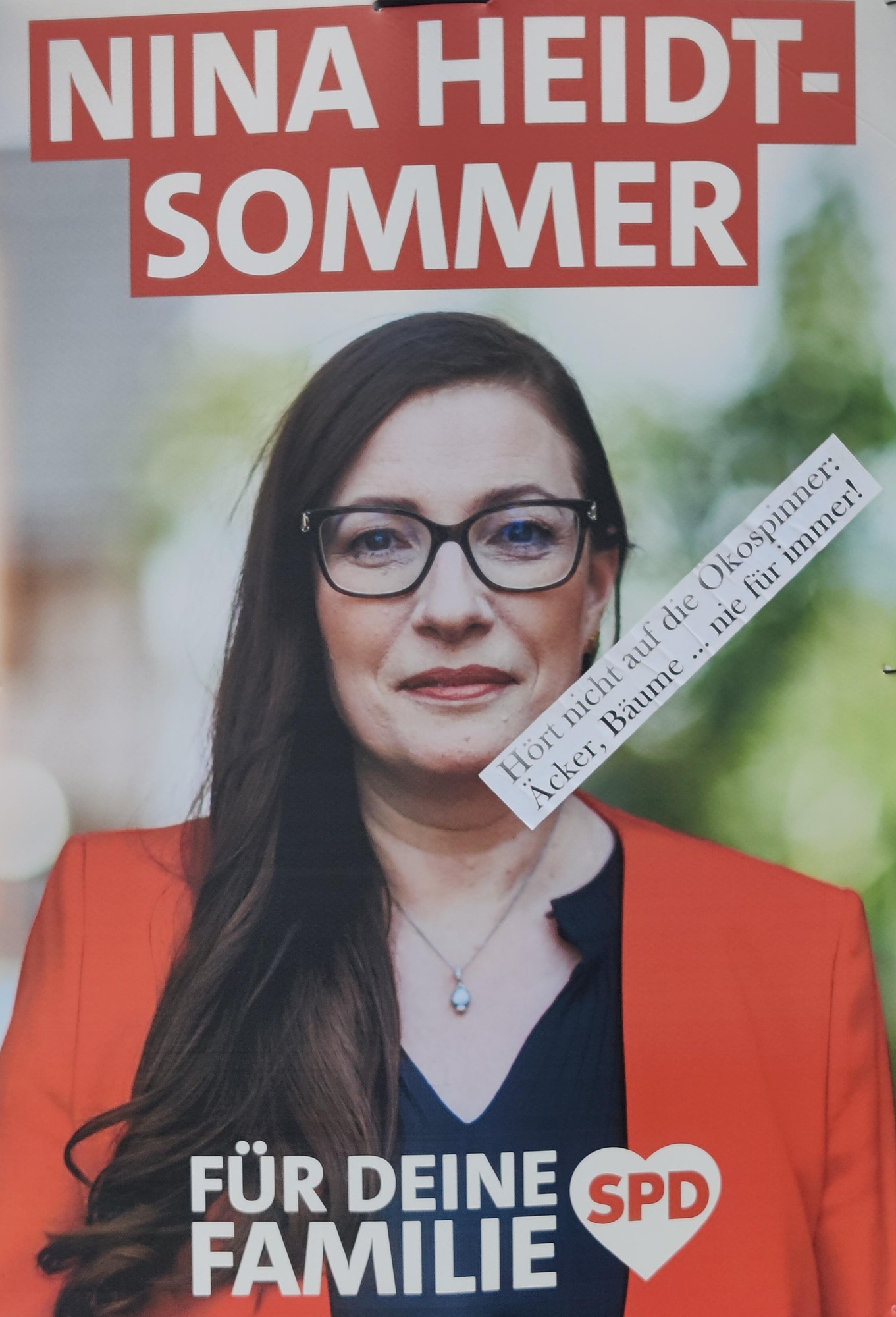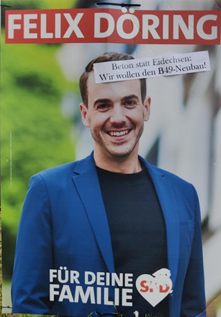 Fast alle Wahlplakate der den B49-Neubau befürwortenden Parteien wiesen in den letzten Februartagen satirische Aufkleber auf, die das Ja der jeweiligen Partei für den Straßenbau begründete. Eine Auswahl: