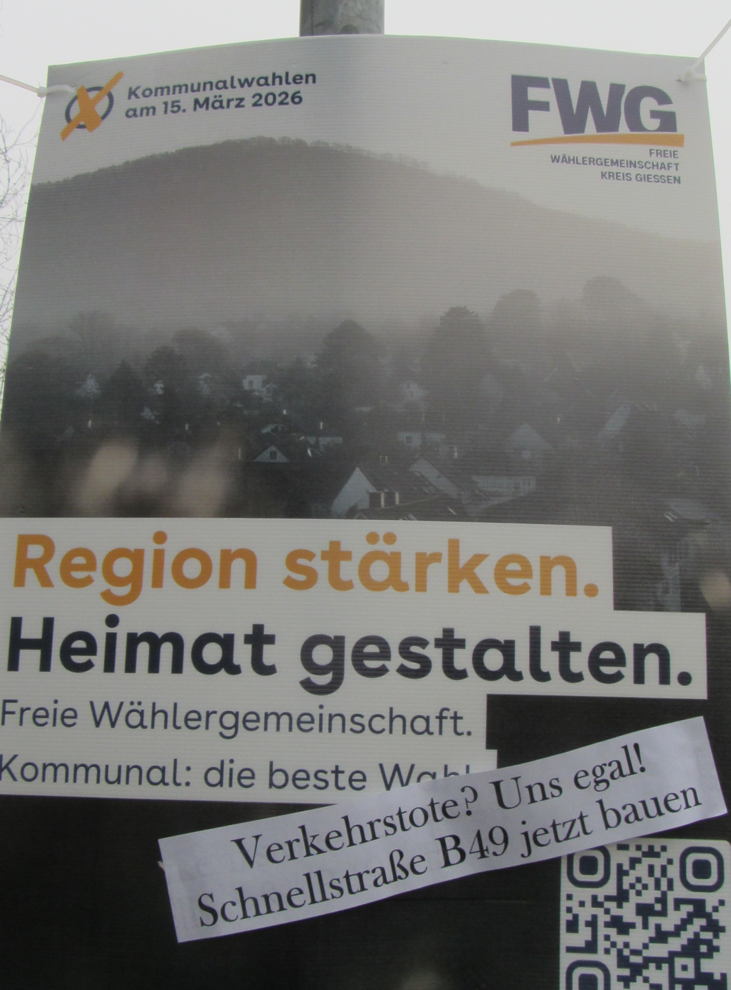 Bericht "Kreative Wahlplakate in Reiskirchen warnen vor Neubau der B49" mit mehr Fotos, in: Gießener Zeitung am 26.2.2026