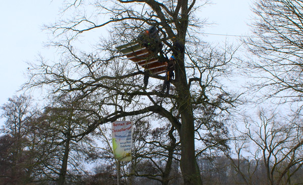 Die Bäume auf der geplanten Trasse des Straßenneubaus B49 um Reiskirchen und Lindenstruth sind besetzt! Dieser Straßenbau findet nicht statt! Und auch sonst keiner mehr! Es reicht! Die Mittel für den Neubau dieser und von 22 anderen Neubauten wurden aus dem Sanierungstopf für Straßen und Schienen geklaut. Machen wir die B49 zu einem Wendepunkt: Vogelsbergbahn ausbauen statt parallel zu Bahn und A5 noch eine Straße bauen!!!