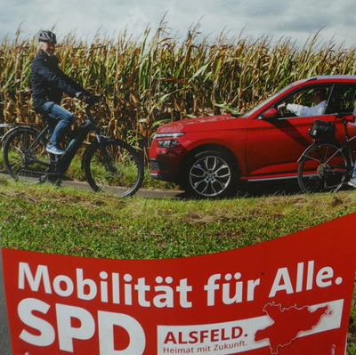 Abbildung: Dümmer geht immer - SPD-Plakat wirbt für Autos auf Feldwegen (Gleichberechtigung ist, wenn Fahrräder sich dort dann an Autos vorbeidrängeln müssen)