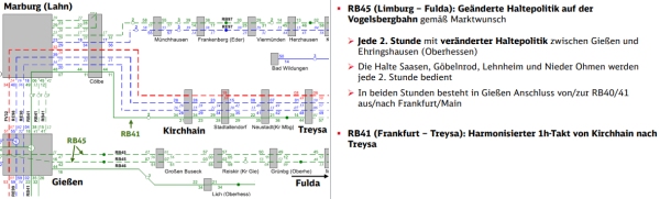 - Einführung einer Ringbahnlinie für die bessere Anbindung an das Rhein-Main-Gebiet, insbesondere Frankfurt ist notwendig, die Umstiegszeiten in Fulda und Gießen deutlich zu reduzieren. Am sinnvollsten geschieht dies mit einer durchgehenden Ringbahn Alsfeld – Gießen – Frankfurt – Hanau – Fulda - Lauterbach- Alsfeld. Diese Ringbahn müsste in beide Richtungen verkehren.