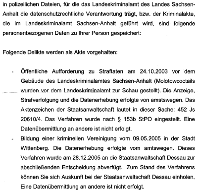 Auszüge aus der Polizeidatei von Sachsen-Anhalt, u.a. zu den Vorwürfen rund um Anti-Luther-Aktionen:
