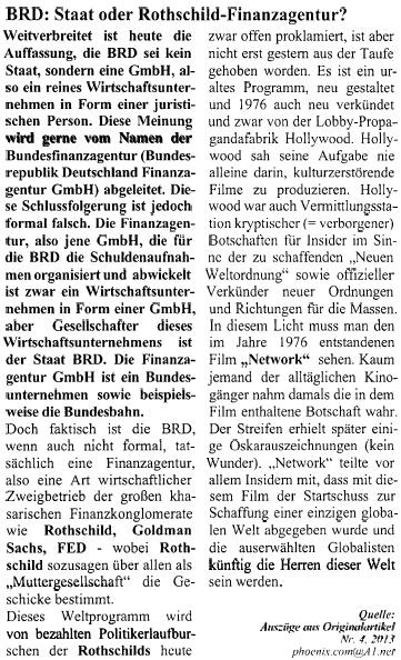 Im November 2013 erreichte der hier gemachte Hinweis, dass die BRD Gesellschafter der Finanzagentur GmbH ist und folglich durch die GmbH in seiner Existenz eher bewiesen als widerlegt wird, auch die VerschwörungstheoretikerInnen selbst. In Stimme&Gegenstimme Nr. 63/13 fand sich ein entsprechender Text. Das Absurde jedoch: Statt den Fehler einfach einzuräumen und den Unsinn fortan nicht weiterzuerzählen, passiert das Gegenteil. Dass die BRD nun doch formal existiert, wird als Argument dafür genommen, dass es noch hinterhältiger ist - nämlich die BRD hintenrum von der Bankiersfamilie Rothschild regiert wird (siehe Ausschnitt rechts).