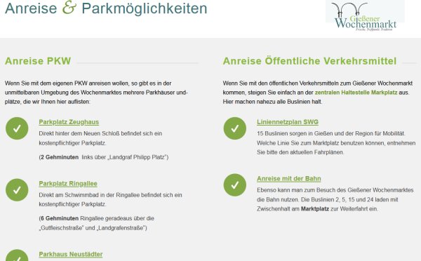 Screenshot der Internetseite der Wochenmarktbetreiber mit Tipps zur Anfahrt