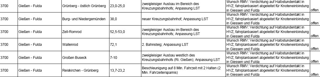 - Schrittweiser 2-spuriger Ausbau der Vogelsbergbahn beginnend mit den Streckenteilen, die schonmal 2-gleisig waren. Der derzeitige Gleiskörper ist gut ausgelastet und bei Verspätungen kommt es schnell zu sich aufbauenden Folgeverspätungen. Für deutlich mehr Personen- und insbesondere Güterverkehr reicht der 1-gleisige Zustand nicht aus. Die Öffnung weiterer Haltestellen (z. B. Wallenrod,..)und zunehmender Güterverkehr erfordern den Ausbau