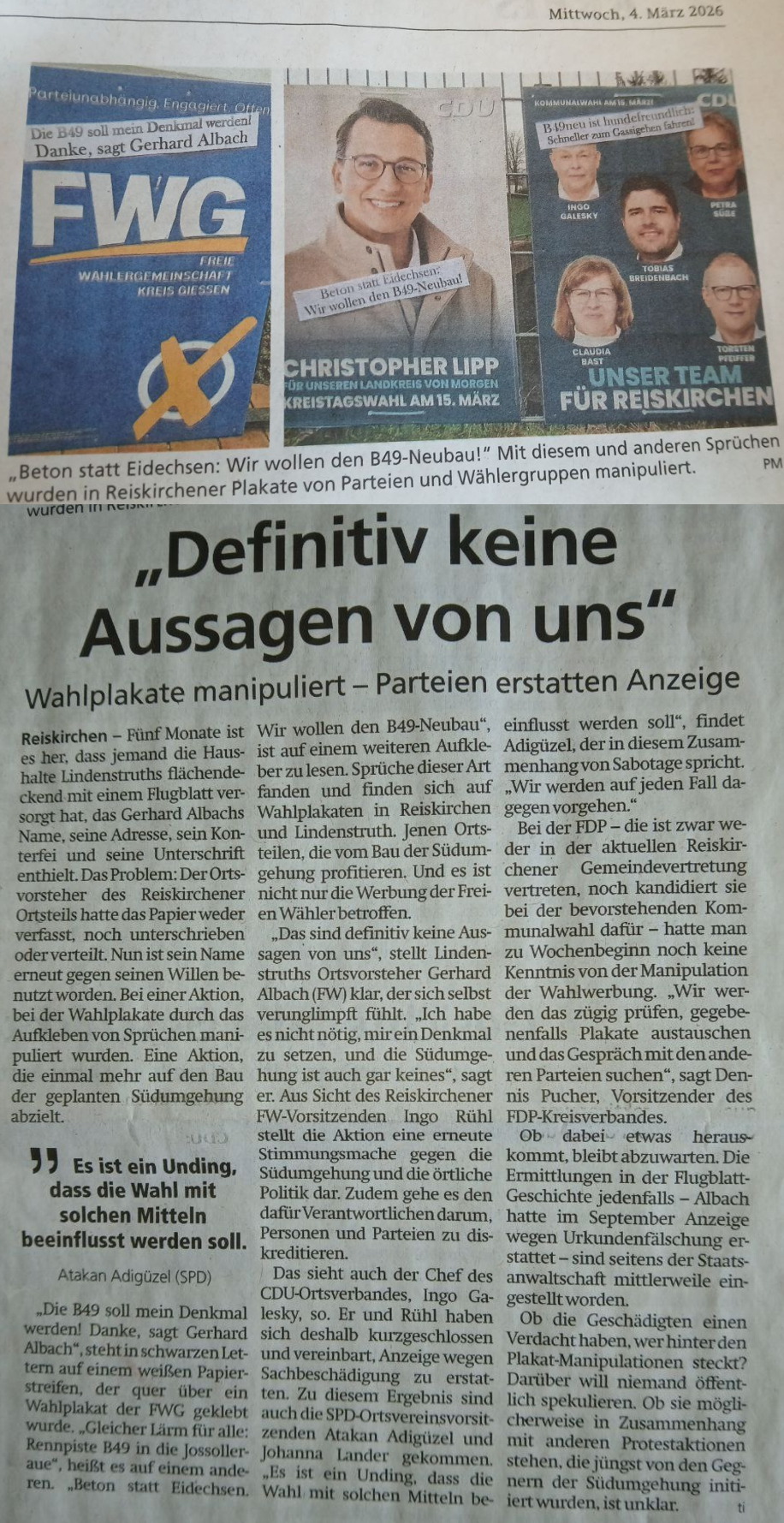 Bericht "Kreative Wahlplakate in Reiskirchen warnen vor Neubau der B49" mit mehr Fotos, in: Gießener Zeitung am 26.2.2026