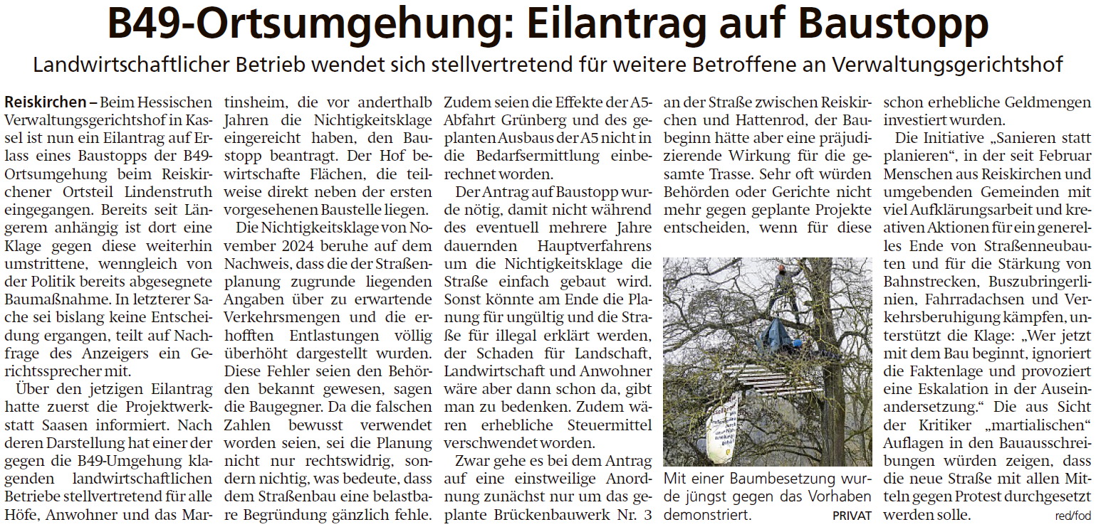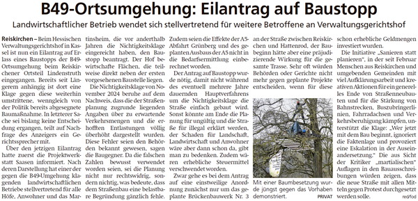 Als dann die Ausschreibung für das Brückenbauwerk 3 im Internet erschien mit Baubeginn am 1.6.2026, musste der Nichtigkeitsklage ein Antrag auf Baustopp hinzugefügt werden. Sonst hätte die Gefahr bestanden, dass sich das Verfahren lange hinziehen würde, während einfach schon gebaut wird. Allerdings sind die Siegeschancen bei so einem Baustoppantrag geringer als in der Hauptsache, da das Gericht hier nur oberflächlich die Gründe prüft. Kommt der Baustopp, wäre das ein Hinweis, dass auch die Hauptklage gewonnen werden könnte. Umgekehrt aber auch. ++ Der Antrag auf Baustopp (anonymisiert, er enthielt zudem etliche Anlagen) ++ Pressetext "Antrag auf Baustopp für B49 (Südumgehung Reiskirchen) eingereicht!" ++ Bericht im Gießener Anzeiger am 23.4.2026