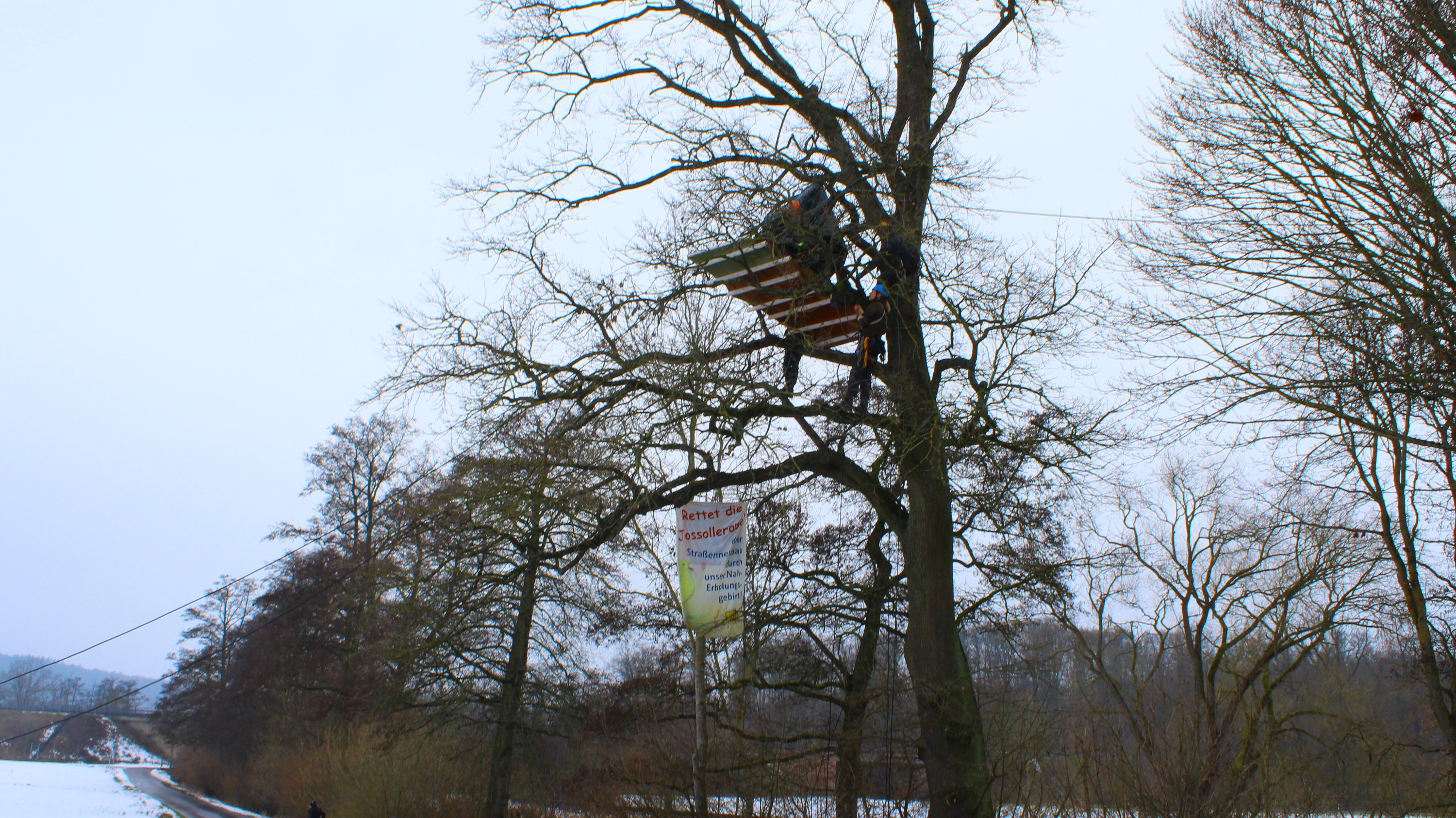 Die Bäume auf der geplanten Trasse des Straßenneubaus B49 um Reiskirchen und Lindenstruth sind besetzt! Dieser Straßenbau findet nicht statt! Und auch sonst keiner mehr! Es reicht! Die Mittel für den Neubau dieser und von 22 anderen Neubauten wurden aus dem Sanierungstopf für Straßen und Schienen geklaut. Machen wir die B49 zu einem Wendepunkt: Vogelsbergbahn ausbauen statt parallel zu Bahn und A5 noch eine Straße bauen!!!