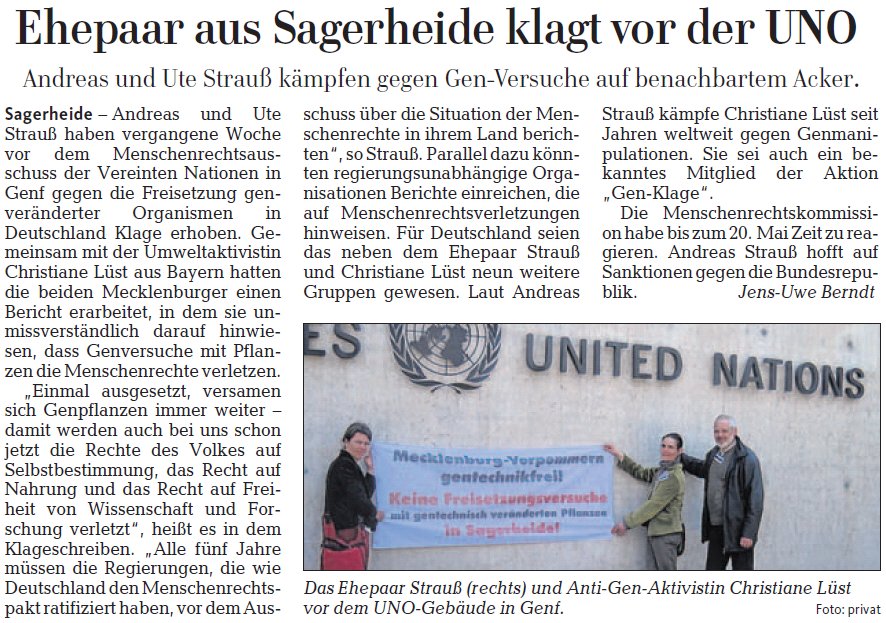 Das war ein netter Erfolg, den GEN-Klage-Aktivistin Christiane Lüst und die Sagerheider AnwohnerInnen am Genversuchsgarten des AgroBioTechnikums im Mai 2011 erreicht haben. Durch einen kritischen, anklagenden Text an das UN-Gremien (sogenannter Parallelbericht) motivierten sie den Ausschuss, von der Bundesregierung einzufordern, genaue Informationen zu liefern, wie diese die Bevölkerung vor der Gentechnik zu schützen gedenke. Damit ist anerkannt, dass Menschen ein Anrecht auf diesen Schutz haben und die Agrogentechnik diesen auch erfordere. Die beiden Mitschreiberlinge des Parallelberichts, die seit vier Jahren an zwei Seiten ihres Grundstücks vom Doppelzaun der Anlage mit mehreren Versuchsfelder voller nicht oder kaum untersuchter Genkonstrukte wohnen, sind gespannt auf die Antworten – schließlich gibt es keinen Schutz vor Auskreuzung, weder durch Zäune noch durch Polizeibeamte. Zudem sind die realen Versuchsfelder alle Jahre äußerst schlampig und entgegen vielen Sicherheitsauflagen betrieben worden.