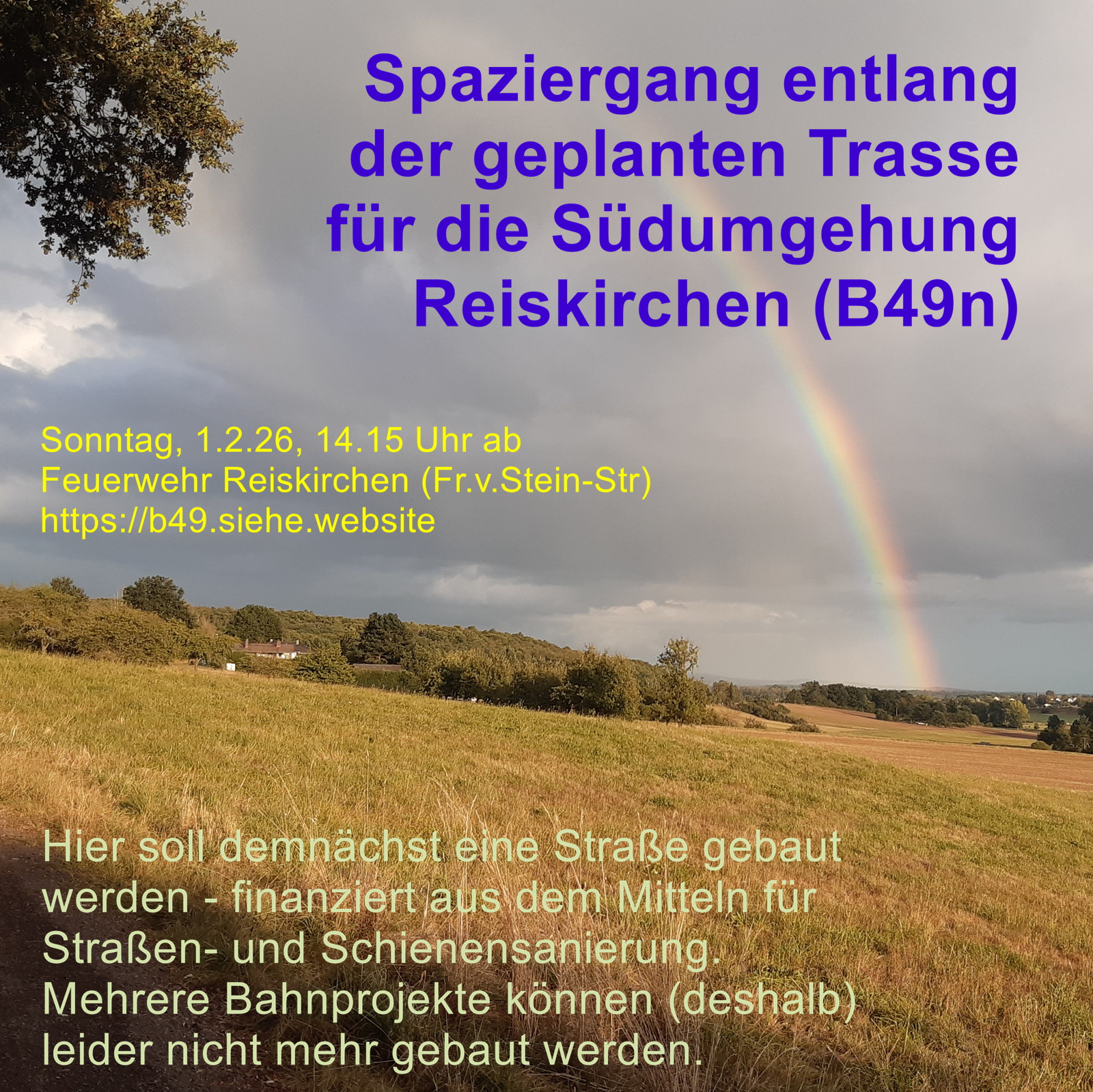 Der Neubau der B49 würde wenig bringen, denn die meisten Wohn- und vor allem alle Gewerbegebiet liegen auf der anderen (Nord-)Seite der Orte. Und: Die Straße würde einen landschaftlich hochwertigen Bereich nahe dem Naturschutzgebiet Josseleraue und Reiskirchens wichtigste Naherholungszone um den Nonn zerlegen.