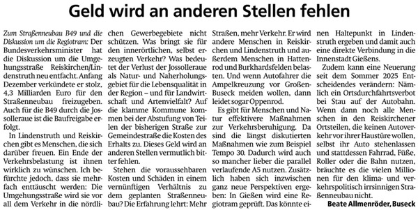 - Presseinfo "Kreis Gießen: B49-Neubau führt zu kaputten Straßen und Schienen ++ Politik streicht Bahnprojekte und forciert 23 Straßenneubauten", auf: Gießener Zeitung am 16.1.2026